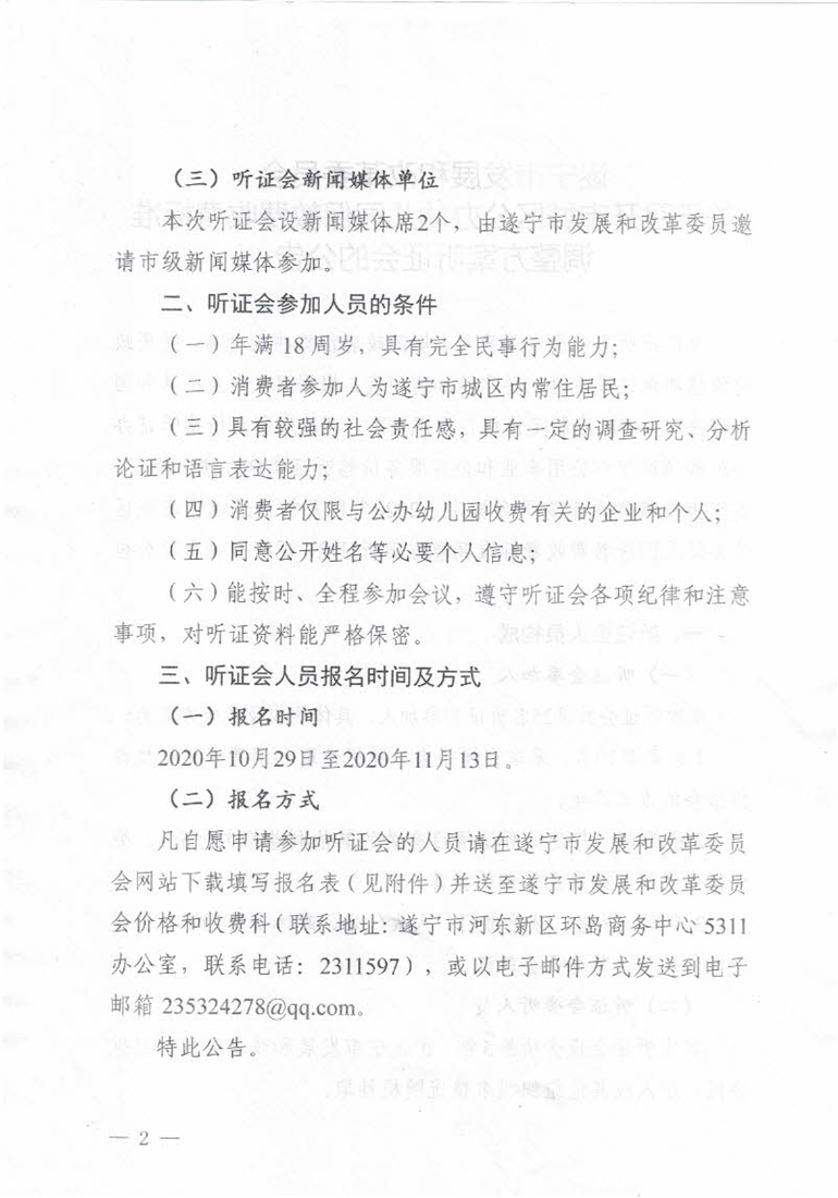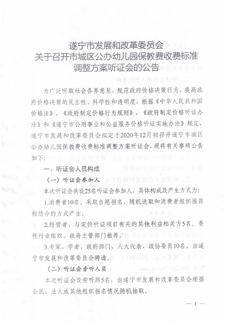遂宁市发展和改革委员会关于召开市城区公办幼儿园保教费收费标准调整方案听证会的公告