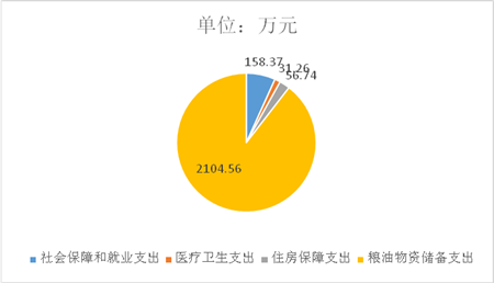2018年一般公共预算财政拨款支出2350.93万元,主要用于以下方面:一般公共服务(类)支出0万元,占0%;教育支出(类)0万元,占0%;科学技术(类)支出0万元,占0%;社会保障和就业(类)支出158.37万元,占6.74%;医疗卫生支出31.26万元,占1.33%;住房保障支出56.74万元,占2.41%;粮油物资储备(类)支出2104.56万元,占89.52 %。
