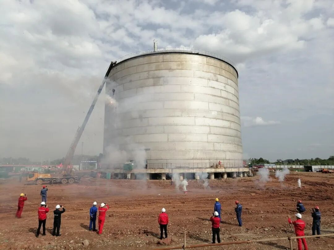 近日,随着最后一圈壁板组对顺利完成,四川能投遂宁储气调峰基地首个储罐外罐正式完工。这是该项目首期建设的一座双金属全容罐,主体高度超过36米,总重量约1454吨,可储存3万立方米LNG(液化天然气)。