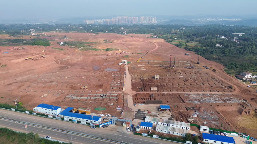 日前,位于遂宁高新技术产业船山园区的钠转干电池项目进入施工关键期。施工现场机械轰鸣,厂房、宿舍楼和办公楼等建筑同步展开作业。目前,办公楼已进入地梁施工阶段,宿舍楼开始基础承台施工,多栋厂房的桩基工程接近尾声。