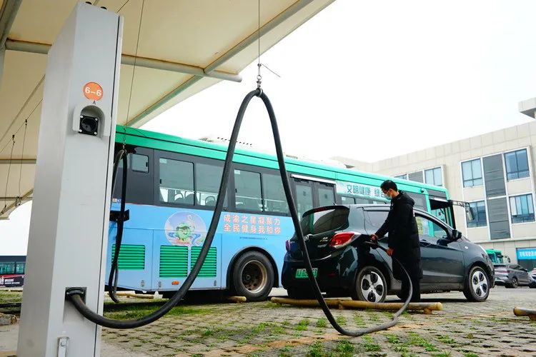 在市城区城南公交停车场电动汽车充电站,市民规范操作充电设备给新能源车充电。