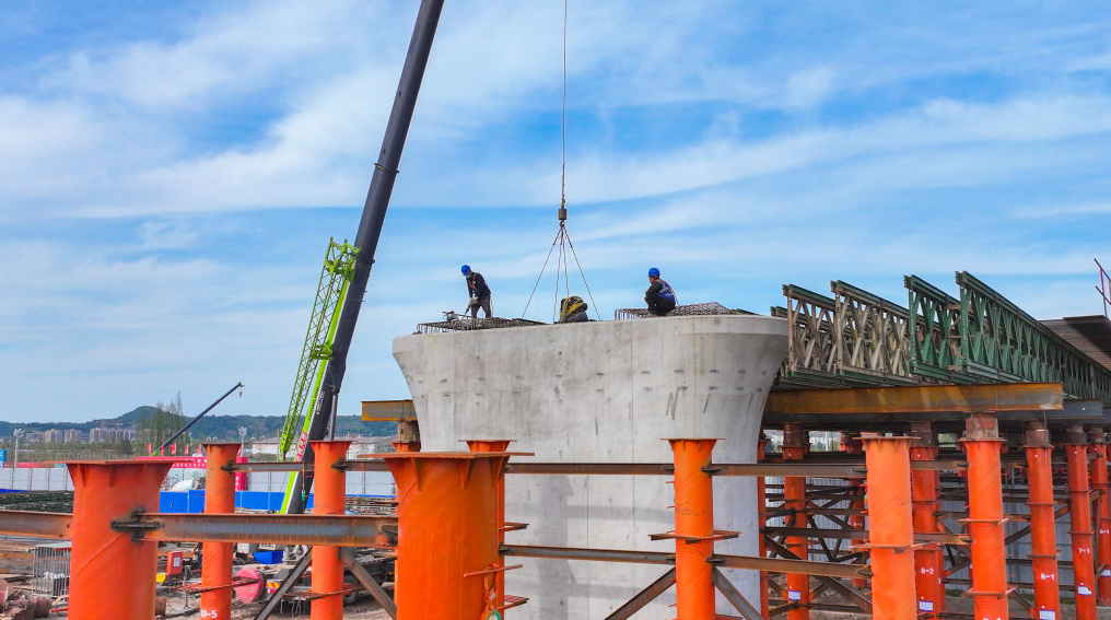 3月25日,在成达万高铁遂宁涪江特大桥建设现场,工人正在进行斜拉桥塔柱及边跨现浇梁施工。