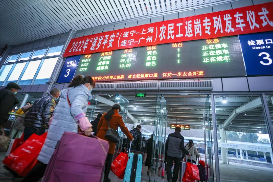 2月11日8:00,D638次遂宁—上海虹桥、D1812次遂宁—广州南“遂岁平安”农民工返岗专列在遂宁火车站举行了发车仪式,561名和764名遂宁籍农民工分别踏上前往上海、广东返岗复工征程,两趟列车将分别于今日22:13、18:00抵达目的地。