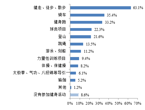 进一步问及受访者“经常参加哪些健身活动”时,表示“没有参加健身活动”的受访者比例为8.6%,表示“健走、徒步、散步”的比例最高,占63.1%;其次是“骑车”,占35.4%;第三是“健身跑”,占33.2%。详见图1(此题多选,相加不等于100%)。