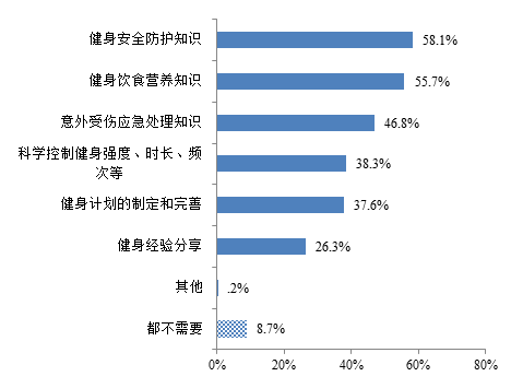 问及受访者“最需要哪些健身知识或常识”时,表示“都不需要”的受访者比例占8.7%,表示“健身安全防护知识(运动损伤的原因及预防等)”的受访者比例最高,占58.1%;其次是“健身饮食营养知识”,占55.7%;第三是“意外受伤应急处理知识”,占46.8%。详见图2(此题多选,相加不等于100%)。
