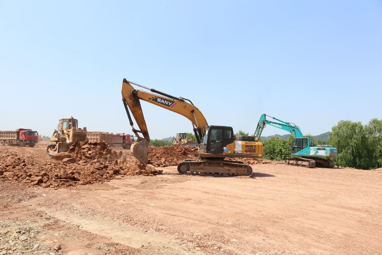 目前,现场投入施工机械20台、运输车60余辆,日均回填泥土8000余立方米。同时,取土场与施工现场均配备洗车池及冲淋设备,7辆洒水车不间断来回洒水,降温降尘,确保有序推进工程建设。