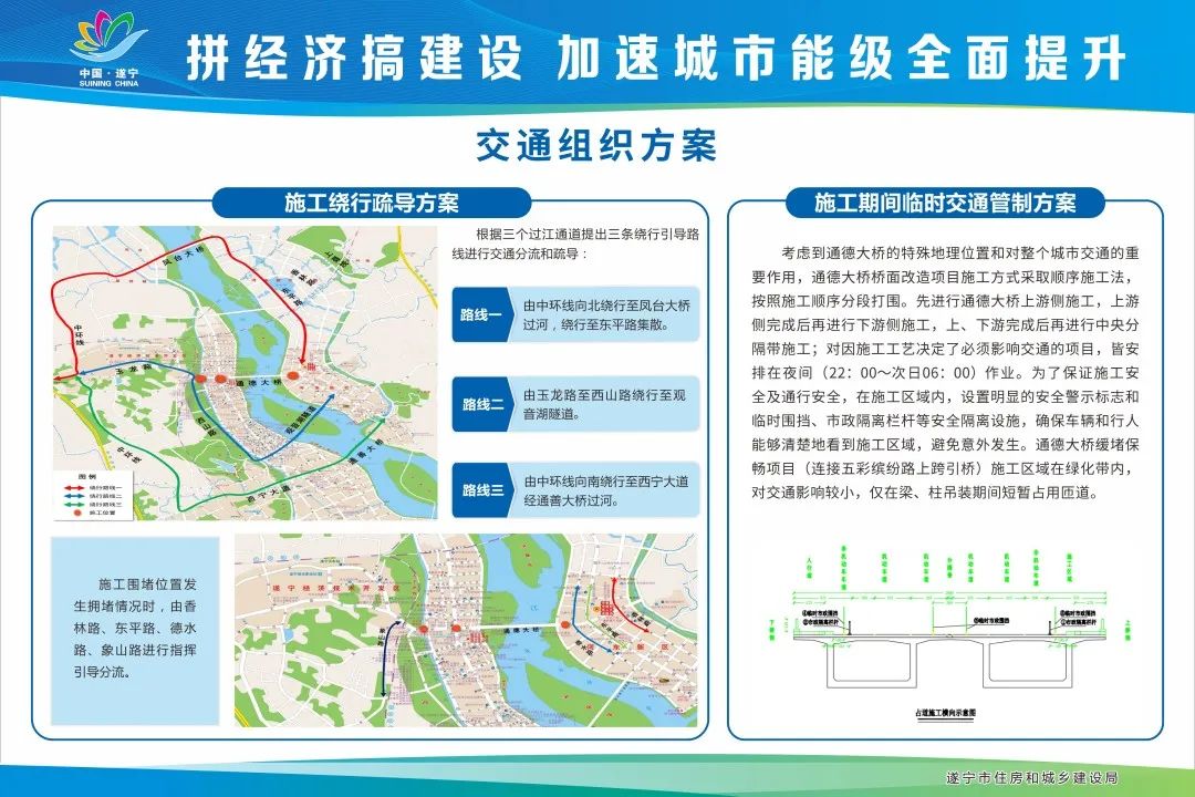 为确保施工期间道路交通安全顺畅,同时考虑到通德大桥的特殊地理位置和对整个城市交通的重要作用,施工方式采取顺序施工法,对因施工工艺必须影响交通的项目,拟安排在夜间(22:00时—次日06:00时)作业。具体占道施工顺序及交通管制如下↓