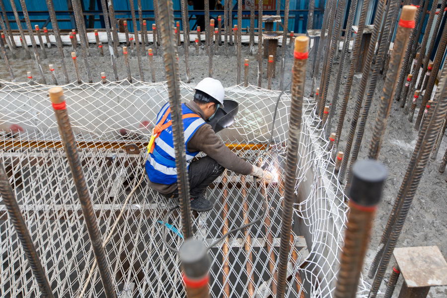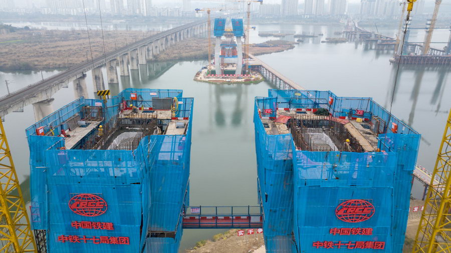 2月28日,在成达万高铁遂宁涪江特大桥项目施工现场,工人正在进行斜拉桥塔柱及边跨现浇梁施工。作为西南地区同类型桥梁中跨度最大的双塔斜拉桥,该桥主跨全长305米,目前90号主塔已完成60.5米,91号主塔已完成54.5米,主桥整体施工进度过半,预计今年7月前完成主塔封顶。