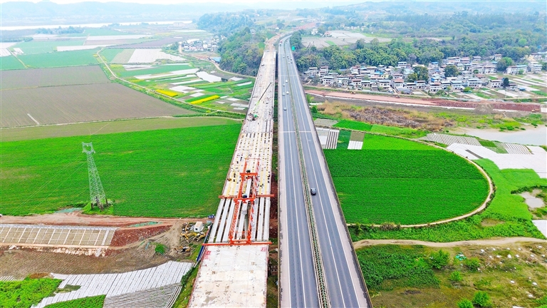 成南高速扩容项目遂宁段自开工以来,已建成桂花涪江特大桥、郪江特大桥、伍家坡隧道、陈家湾隧道等控制性工程,各类新建、改建互通立交等建设稳步推进,目前累计完成投资64.1亿元,力争今年底基本具备通车条件。图为3月31日17时,成南高速扩容项目遂宁段桂花涪江特大桥实现合龙。