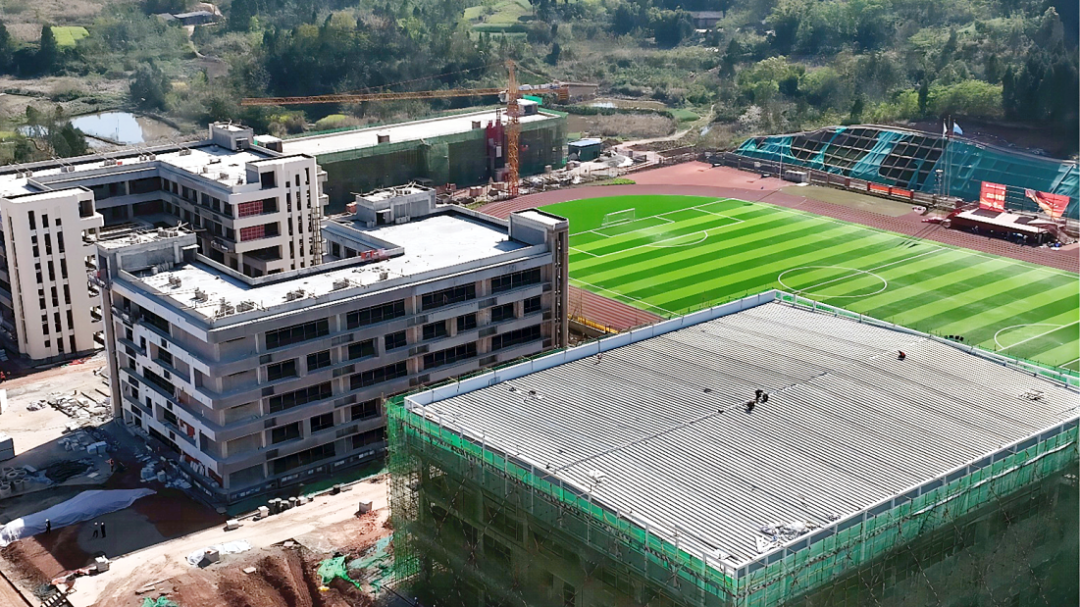 蓬溪县教育及产教融合发展项目二期主要包含室外体育场、室外广场及8栋单体建筑的全部施工。中铁七局集团有限公司项目副总工程师张博文说:“目前,8栋单体建筑已基本完成主体及二次结构施工,正在进行装饰装修,室外体育场已于2023年11月交付校方进行使用。”