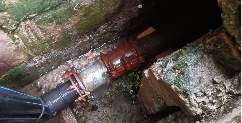 隐患:消防给水主水管损坏,严重漏水,铸铁管与PE管接头处损坏。