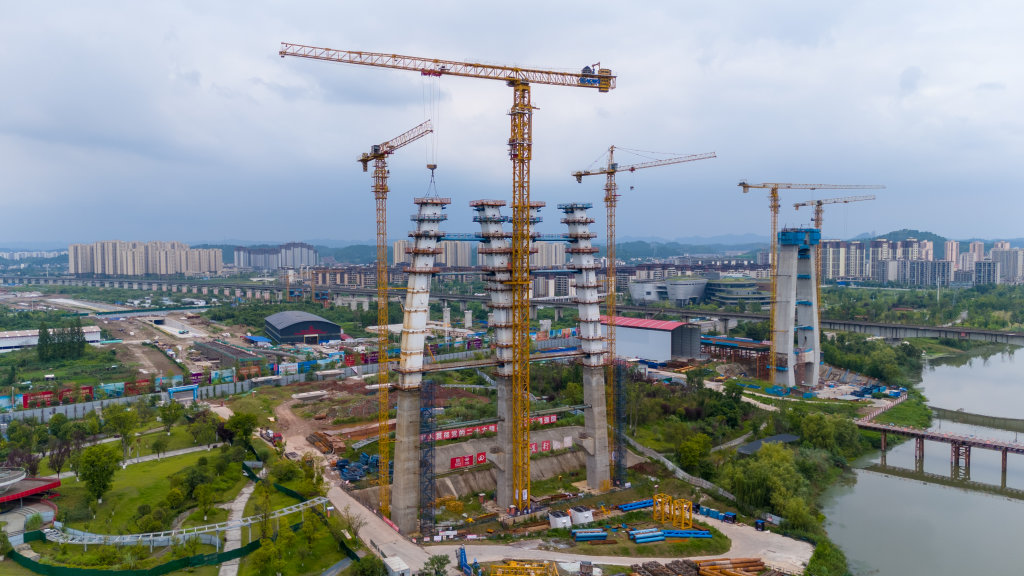 据项目总工程师刘猛介绍,截至目前,项目已完成跨涪江桥梁全部下部构造、河东区域隧道主体等施工,两座主桥主塔正在进行钢壳安装焊接,东、西引桥持续开展上部现浇箱梁等部位的施工。