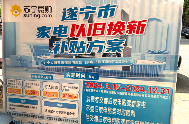 据了解,本次家电“以旧换新”活动补贴时间从2024年6月15日至2024年12月31日。活动将按照购买单台(套)新家电含税实际成交价格的10%给予补贴,单台(套)最高补贴不超过1000元。每人限购3台(套),个人补贴累计不超过3000元。参与活动的新家电包含电视机、电冰箱(冰柜)、洗衣机(干衣机)、空调、投影仪、集成灶、热水器这七类绿色智能电器。“我们会将新家电送货上门、免费安装,并拉走旧家电。”安居苏宁易购门店销售经理李尚华介绍,“以旧换新”政策实施接近两个月,门店整体实施方案为厂家优惠10%,顾客“以旧换新”可再享受补贴政策10%,门店电器销量与去年同期相比增长了10%以上。