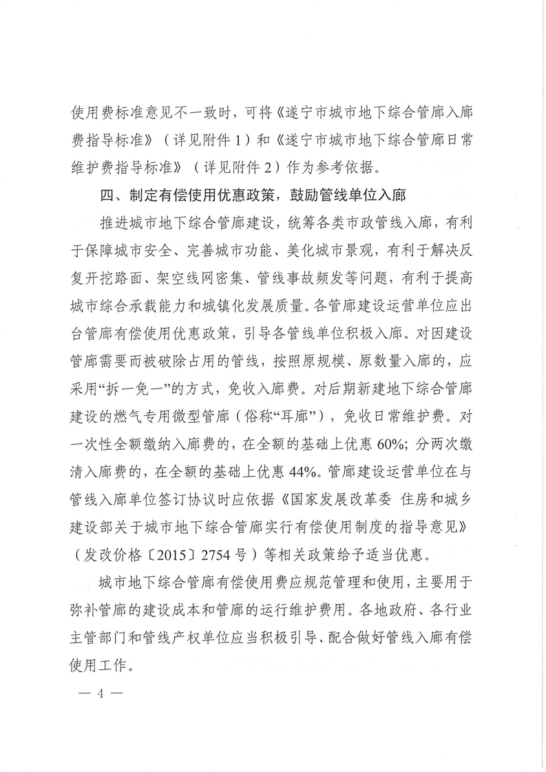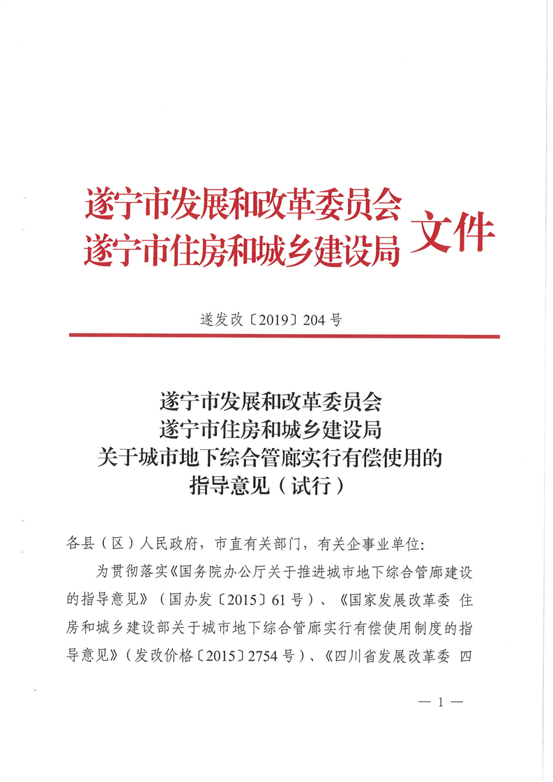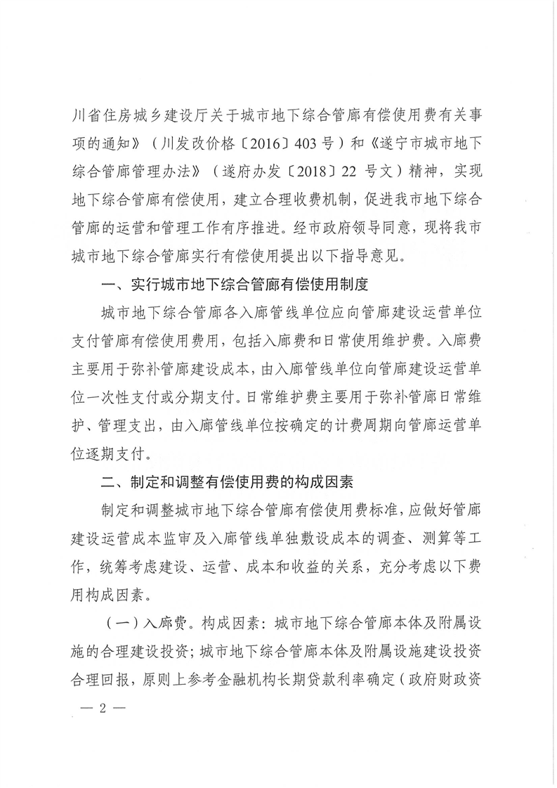 遂宁市发展和改革委员会遂宁市住房和城乡建设局关于城市地下综合管廊实行有偿使用的指导意见(试行)